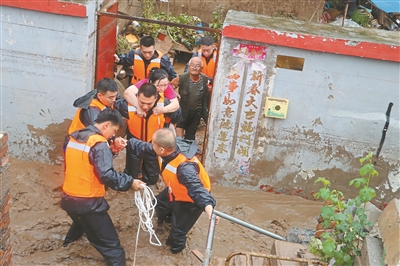 “2023北京抗洪救灾群体”——青龙湖防汛救灾应急救援队在淤泥中转移被困老人。