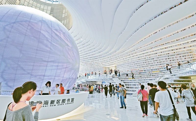 天津滨海新区文化中心图书馆面积33700平方米、可藏书120万册、座席1000多个,其标志形象是“滨海之眼”和“书山”,多次以“中国最美图书馆”刷屏全网。图为滨海新区文化中心图书馆。天津市委宣传部供图
