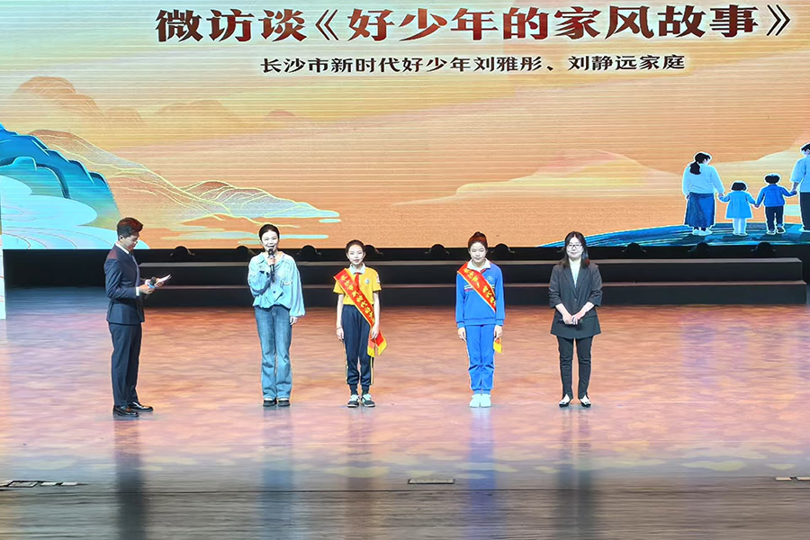 在《好少年的家风故事》主题微访谈环节中,长沙市“新时代好少年”刘雅彤分享了家风家训是如何引导自己健康成长,传承红色文化,展现新时代少年的风采和担当。长沙市“新时代好少年”刘静远家庭也登台分享了刘静远的励志故事。尽管刘静远先天性双耳失聪,但她的家人始终鼓励她勇敢面对生活中的挑战,这种积极向上的家风,不仅让刘静远学会了听和说,并凭借美妙的歌声多次登上央视舞台。当她清澈的歌声在现场响起时,现场观众报以雷鸣般的掌声,彰显了积极向上家风的力量。