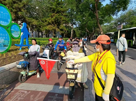 石景山区文明引导员在辖区重点路口、公交地铁站台开展文明倡导行动。