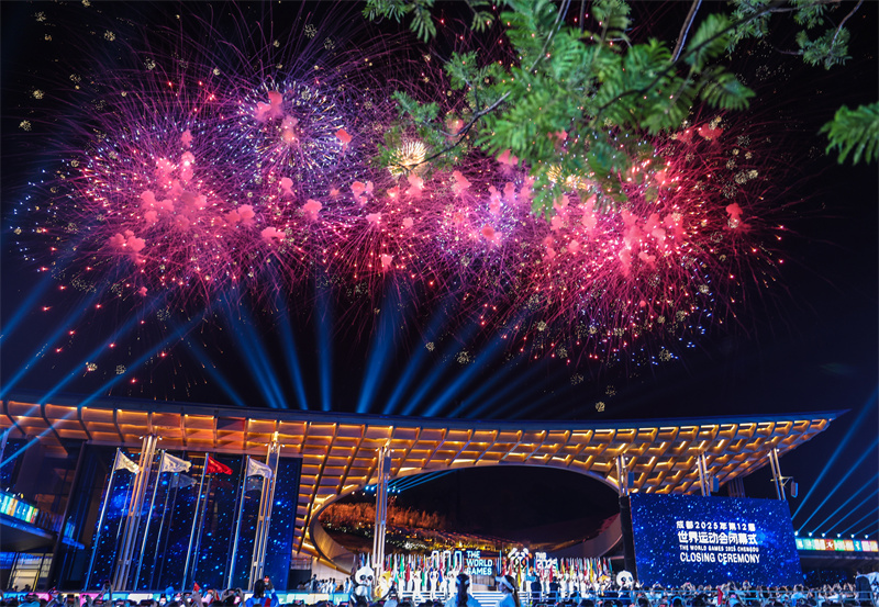 这是8月17日拍摄的闭幕式上的焰火表演。当日,第12届世界运动会闭幕式在成都举行。新华社记者 王翔 摄