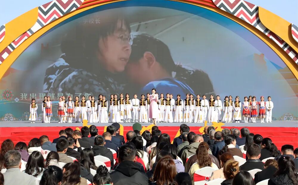 演员汤梦佳与阿克苏市第七⼩学的孩子们一起表演情景音乐剧《校园笔记》。王小伟 摄