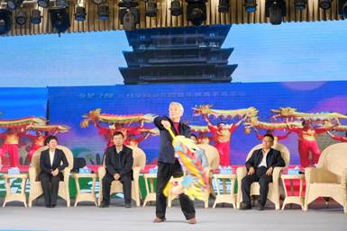 11月21日,“中国好人”闫克元在“文明中国·看汉中”研讨会上表演龙舞。吕媛媛 摄