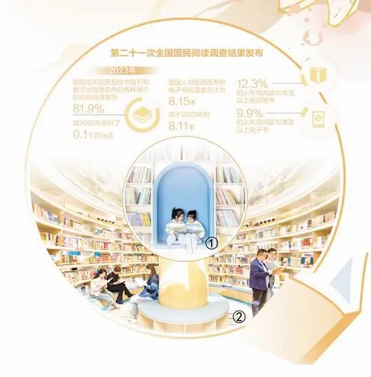 由中国新闻出版研究院发布的第二十一次全国国民阅读调查结果显示,2023年,我国成年国民包括书报刊和数字出版物在内的各种媒介的综合阅读率为81.9%,较2022年的81.8%提升了0.1个百分点。
