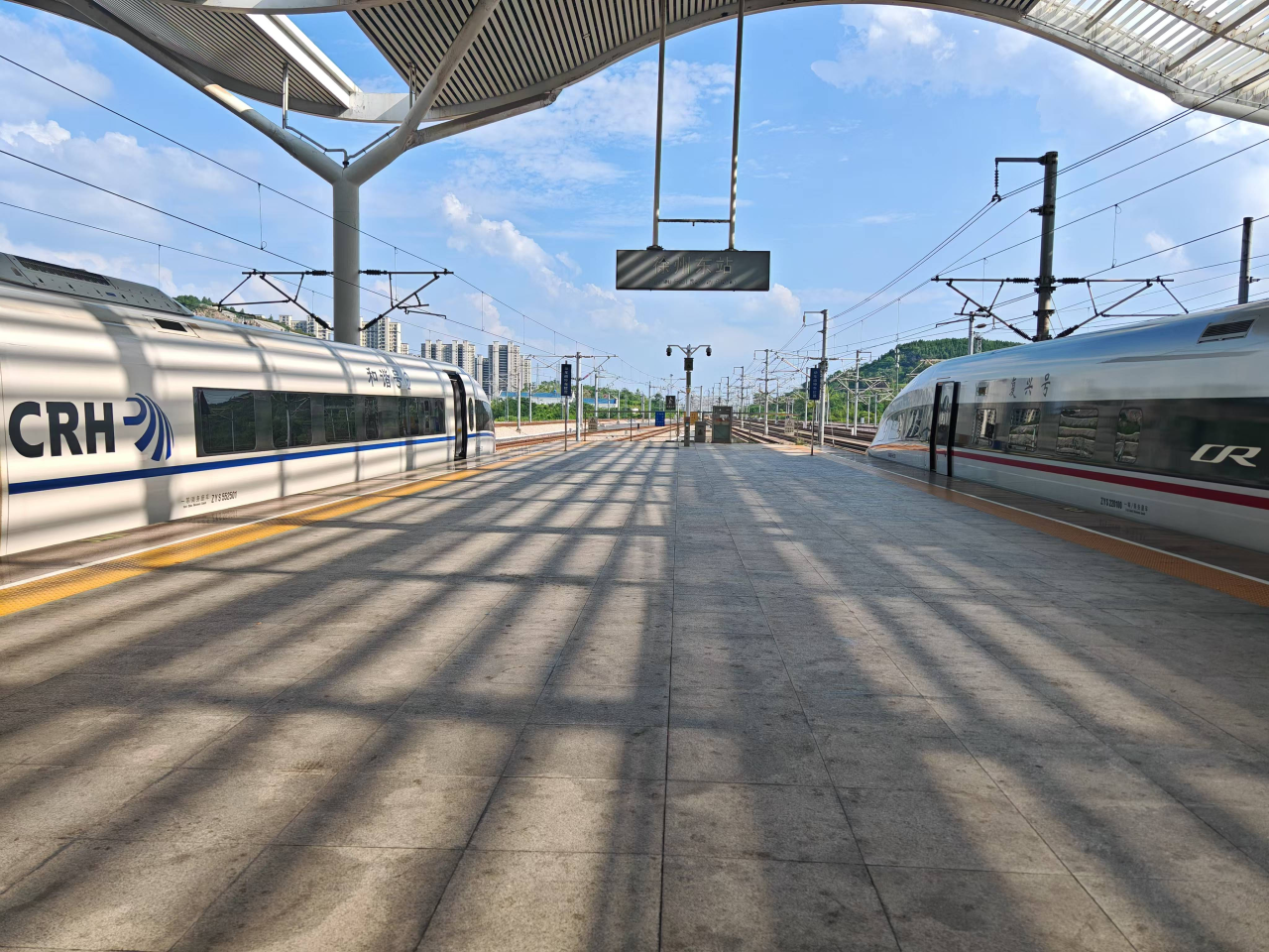 和谐号与复兴号列车在徐州东站相遇。