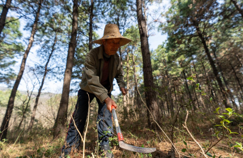 采访报道组一边和他聊着经历,一边跟随他往山上走去。一路上,他的手一直没闲着,不断忙着为茶树除去杂草,那质朴的动作不会因为镜头而停歇;说起1996年山火毁林1700亩的打击,他下意识地回避失去多位亲人的伤痛,只是一遍又一遍重复地强调“树都烧光了,很可惜”;“如今儿子都愿意,他们帮我一起干活,孙子很有出息,都在城里读书。”,说起这些,他没有掩饰自己骄傲的神情……