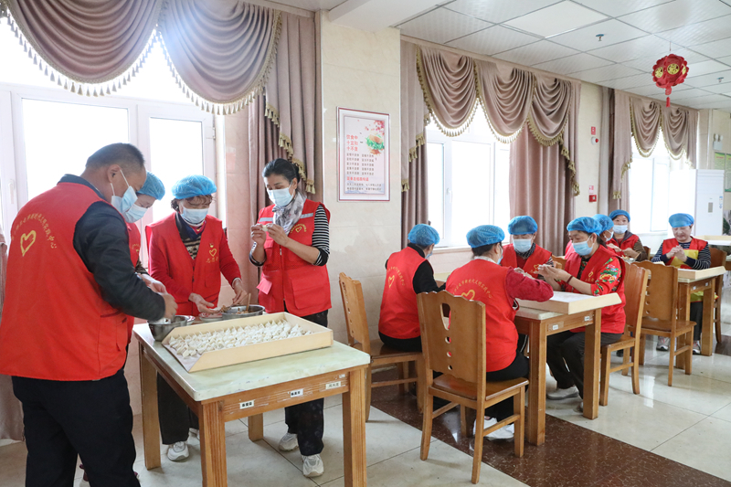 北屯市阳光志愿者协会志愿者们正在养老院为老人们包饺子。