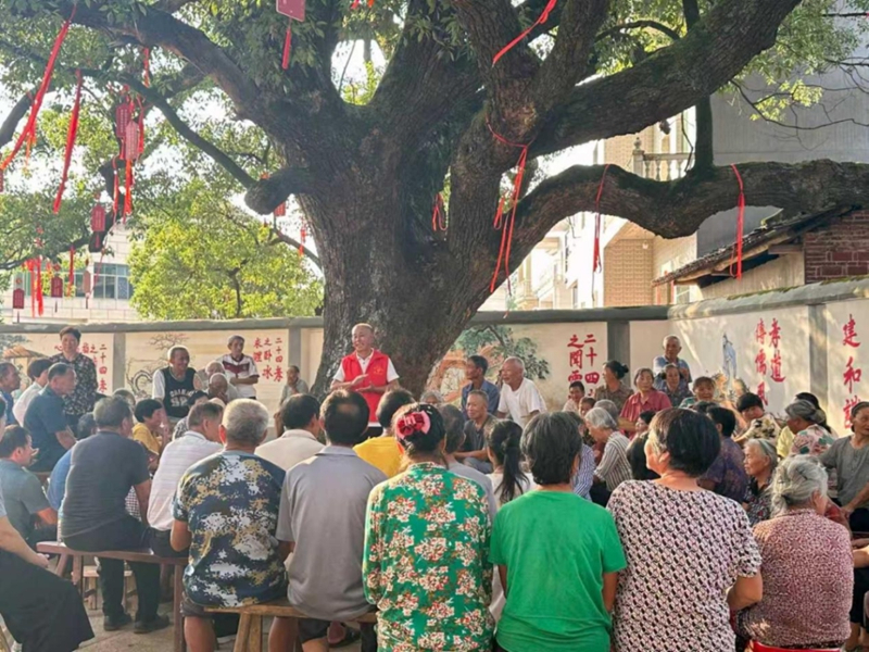 在小璜镇鲁家村的大古树下,“挎包服务队”正在宣讲。宣讲员李华林打开挎包,取出《乡村振兴政策手册》,问大家:“‘污水有了家,垃圾有人拉,村村盛开文明花’,这句话讲的是什么?”村民们抢着回答,现场笑声不断。